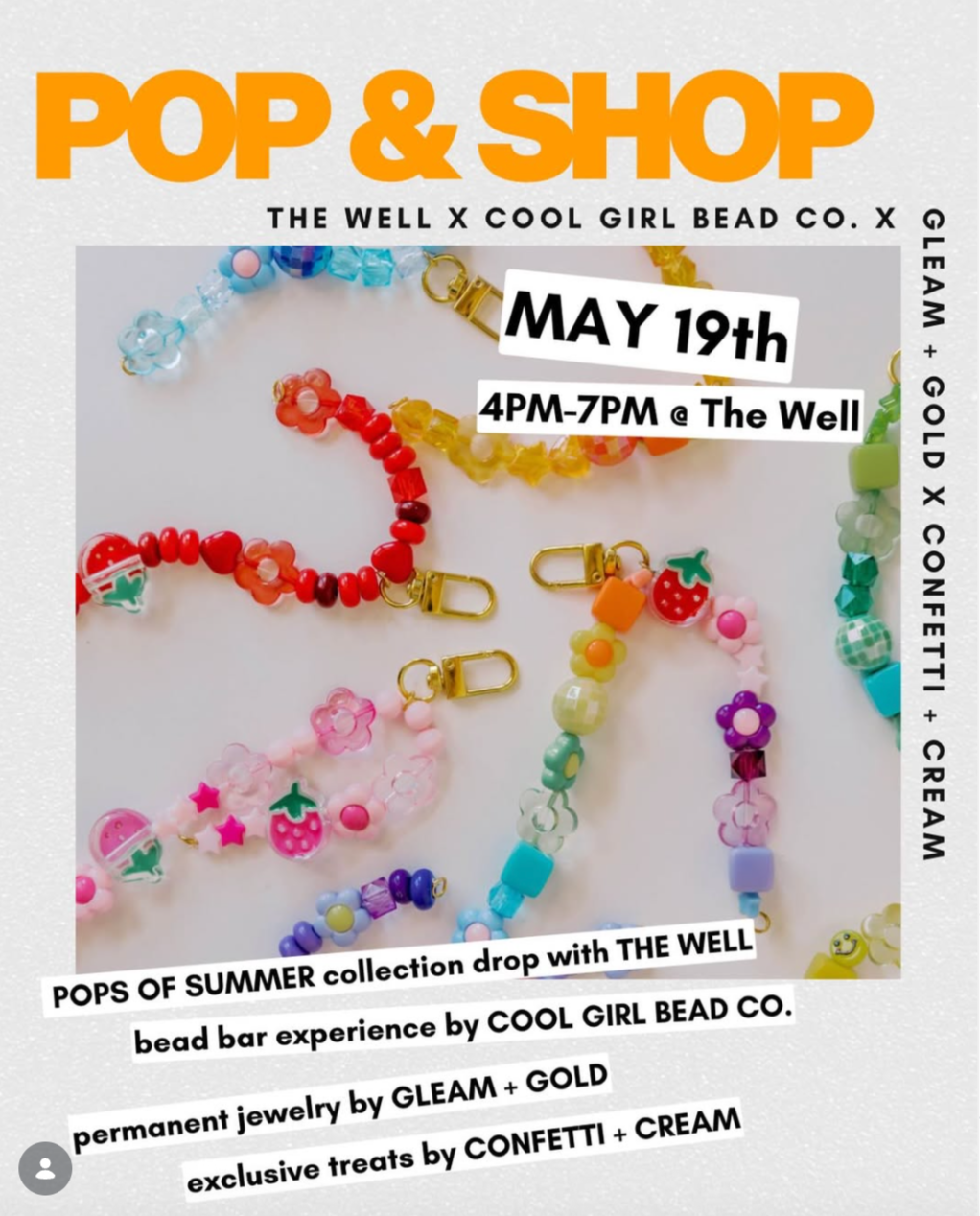 ☀️ early access to the Pops of Summer collection drop (you’ll see it FIRST) by The Well 💖 bead bar experience by Cool Girl Bead Co. — grad gifts, teacher gifts, beach bag glow-ups…and, CUSTOM! ✨ permanent jewelry by Gleam + Gold 🍪 free funfetti cookie w/ purchase — Confetti & Cream